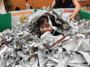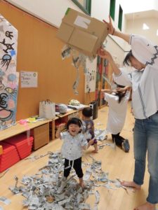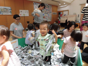 うさちゃんクラブで新聞あそびをしましたよ。新聞あそびは、たくさんちぎってビリビリ破いて、音や感触など五感を使って遊べます!!