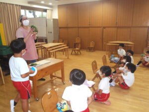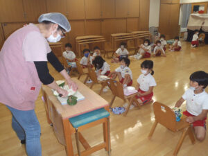 子ども達からは、「きゅうりの匂いがする」「梨みたい!」などの声がありました。中には、「ちょっと…臭いがする」と言った子もいましたが、目の前で切り分けられた冬瓜が調理されて出てくると、美味しそうに食べてくれました。