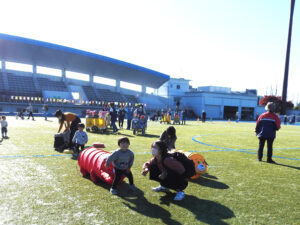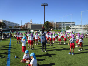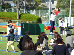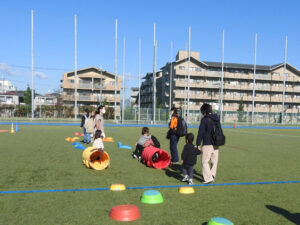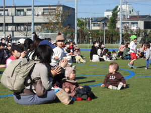 少し暑いくらいの青空の下、広い人工芝の上、楽しそうに遊んでいる200名の親子の姿がみられました。