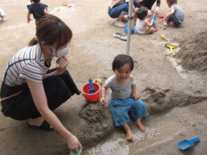 初めての泥の感触を嫌がる子もいましたが徐々に慣れ、スコップで泥をすくったり、お母さんと水路の中を歩いたり、土山を登ったり、楽しんでいました。