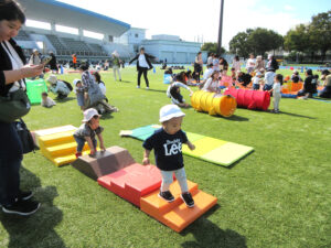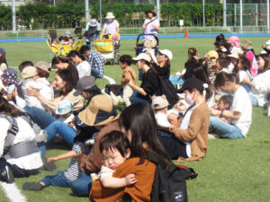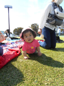 ハイハイ前の赤ちゃんもおひさまの下で絵本をみたり、はじめて芝生の上でひなたぼっこ。
