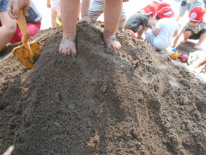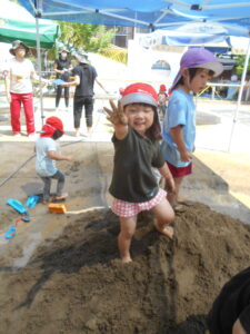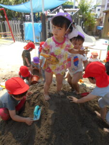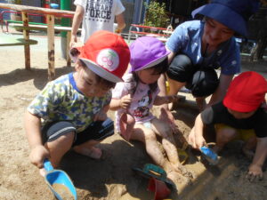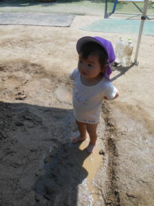 1歳児(紫帽子)2歳児(赤帽子)クラスの様子です。