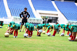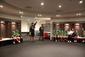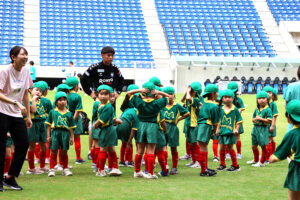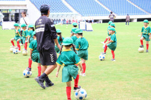 Jリーグの人気チーム、ガンバ大阪の本拠地。「パナソニックスタジアム吹田」内グラウンド(ピッチ)でジュニアスクールコーチ(日本サッカー協会公認ライセンス保持者)からサッカーを教えていただきました。