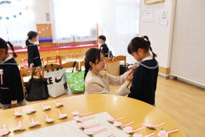 ドキドキした表情で登園してきた子ども達。担任の先生から、胸にお花を付けてもらいました。