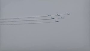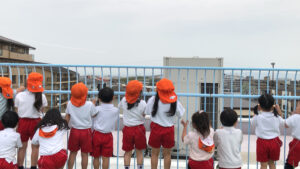 「ブルーインパルス」大阪上空を飛行万博開幕日向けのテストがありました。屋上でこどもたちと見ました。