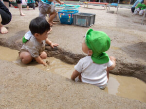 初めての泥んこあそび。思わず泣いてしまう子もいたり、保育教諭と一緒が楽しくて感触を楽しんでいる子もいました。