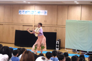 かのは先生のフラダンスでは、子ども達も、「きれい」「すごーい」と思わず声を出している子も…