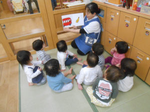 ”おべんとうバス”の絵本では、子ども達が手を挙げてお返事します。最後のおべんとうでは、口をあけて「まんまー」と言っていますよ。