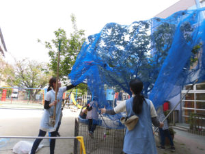 鳥に食べられないように、職員でネットを掛けました。