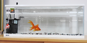 玄関にいる金魚のきんちゃんは広い水槽になってご機嫌です♪