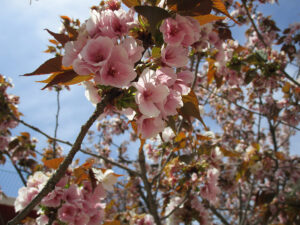園庭にある遅咲きの山桜が満開です。