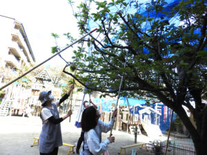 その為、鳥などに食べられないように、2階以上に成長した木に保育教諭がネットを掛けました。