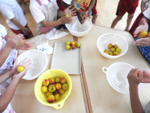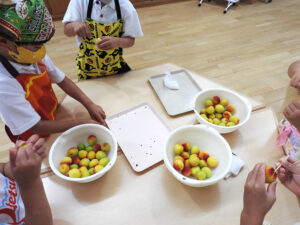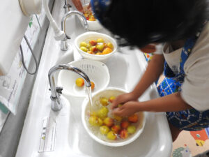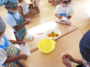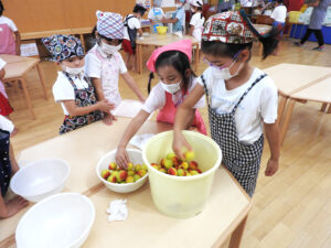 爪楊枝を使って、きれいに梅のヘタをとります。傷つけないように・・・子ども達は真剣です。