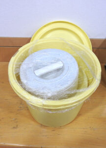 最後にホワイトリカーを入れて消毒して、重しを乗せ、数日変化を見守ります。